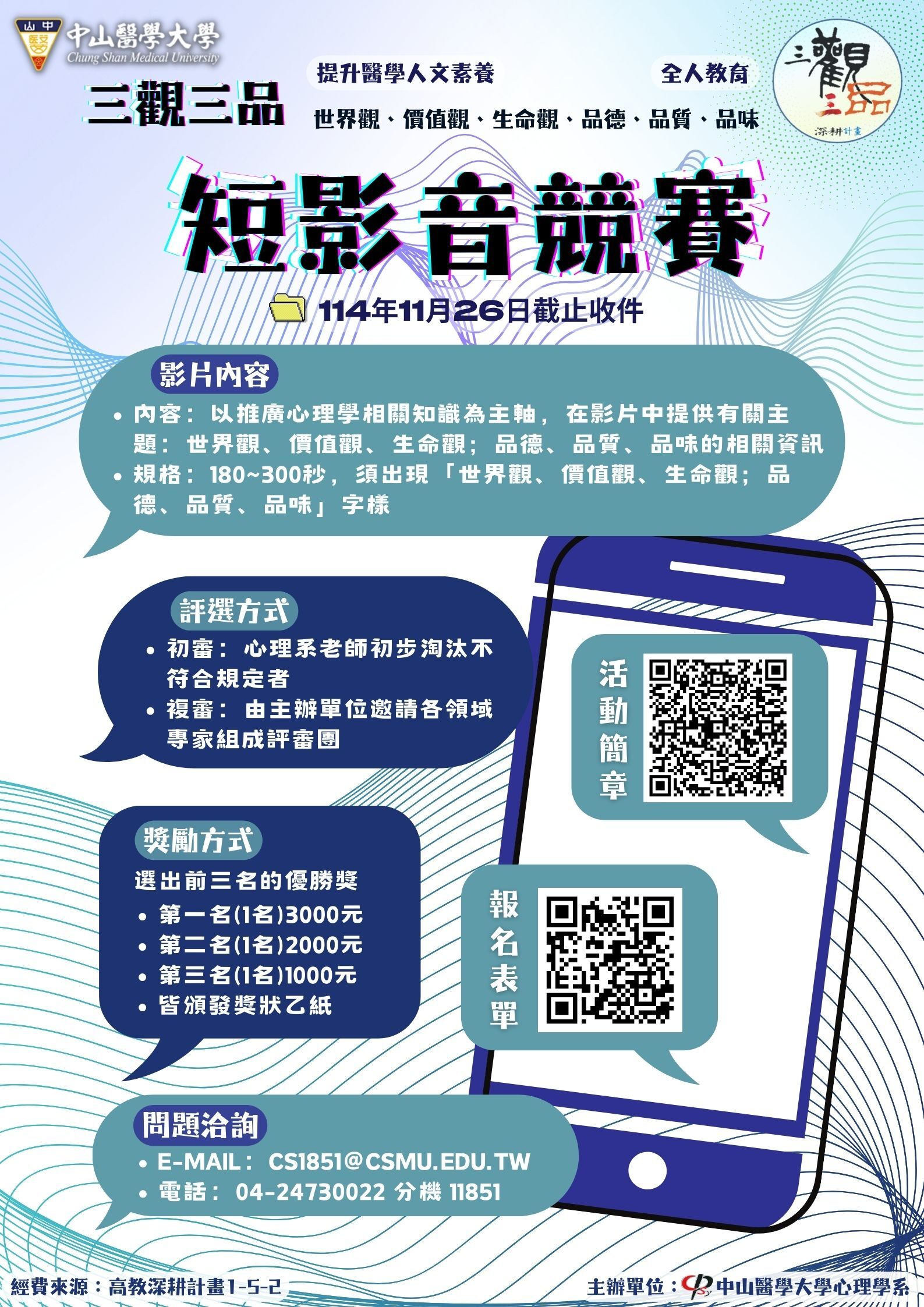 114/11/26(三) 截止收件,114學年度「三觀三品短影音競賽」報名簡章