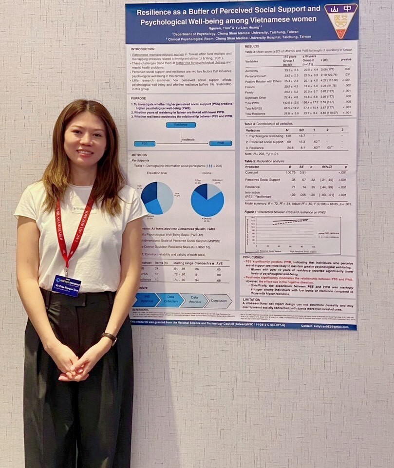 再來,隨著研究逐步成熟,我也有機會在國內學術研討會中發表研究成果,並進一步參與於新加坡舉辦的國際研討會。透過實際參與國際學術場合,我得以觀察不同研究者的研究呈現方式、解說風格,以及如何進行學術對話。這些都讓我對學術交流有了更具體且深刻的認識。在研討會期間,透過聆聽來自不同國家學者的研究發表,我接觸到多元的研究主題與研究方法,也看見心理學研究在不同文化與社會脈絡中的應用與發展。不僅如此,在這過程中,我也獲得來自不同國家研究者與專家的提問與回饋,這些問題多半聚焦於研究概念的釐清、研究設計的細節,以及研究結果的詮釋。透過回應這些提問,我得以再次檢視自身研究的不足之處,也進一步思考未來可以深化與修正的方向。這樣的學術互動,使研究不再只是完成一項成果,而成為一個持續發展與調整的歷程。