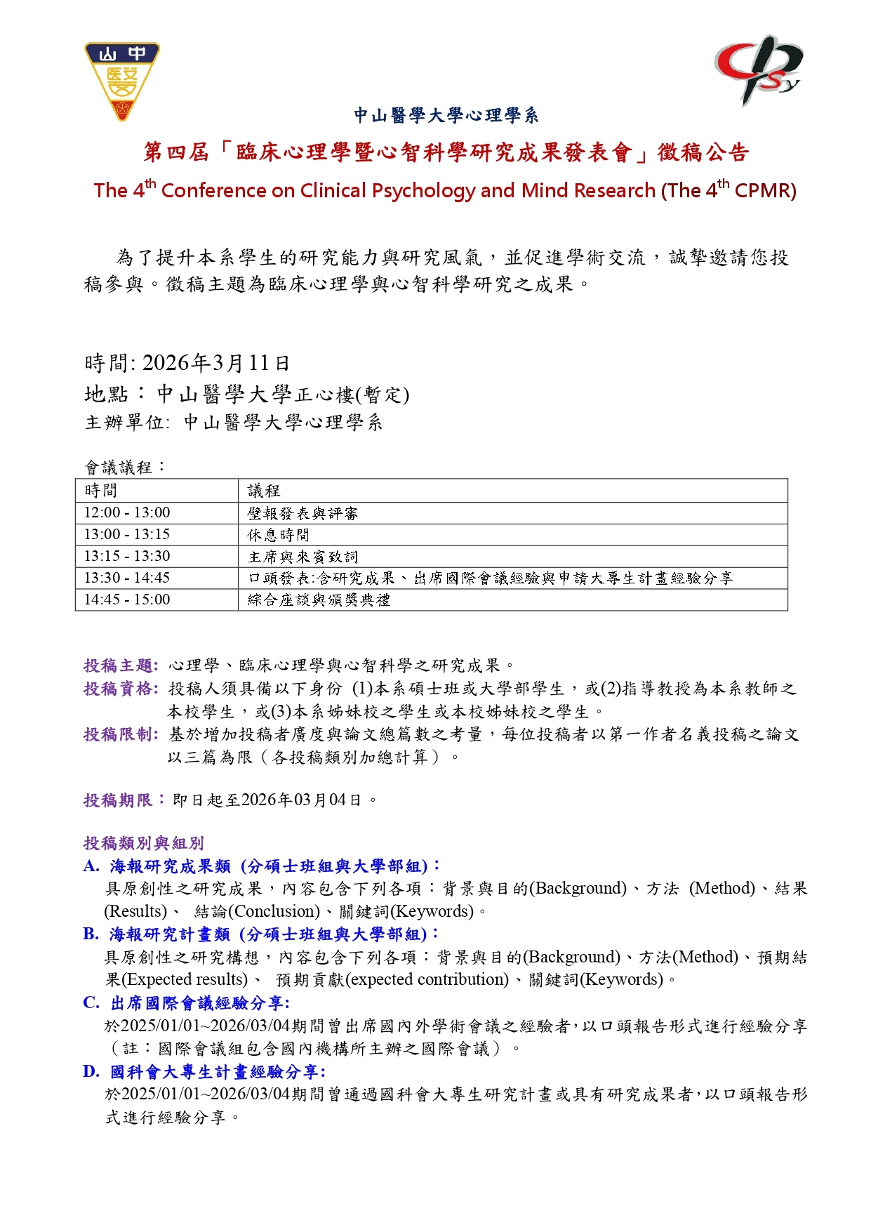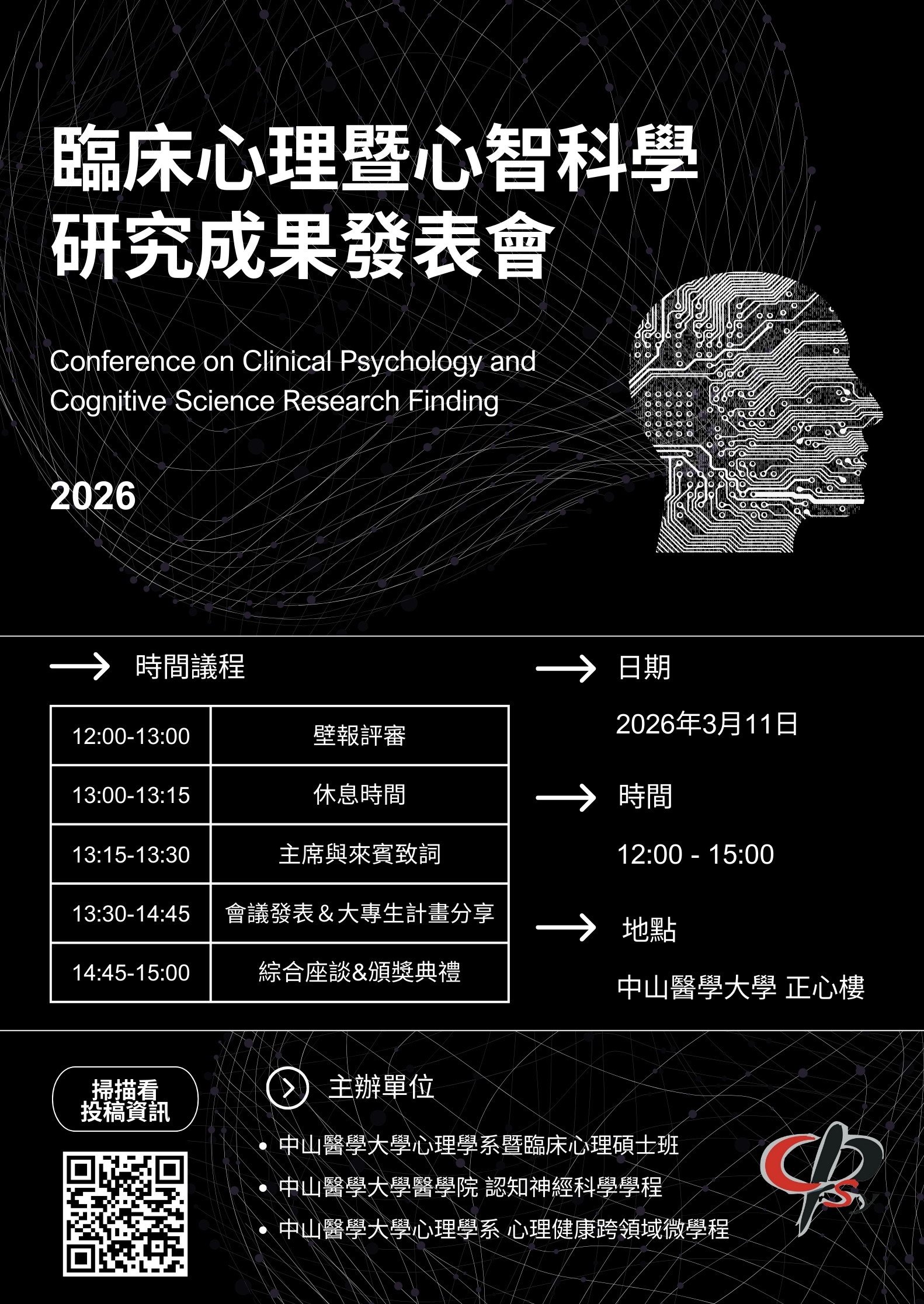 115/03/11(三)2026年【臨床心理暨心智科學研究成果發表會】徵稿公告